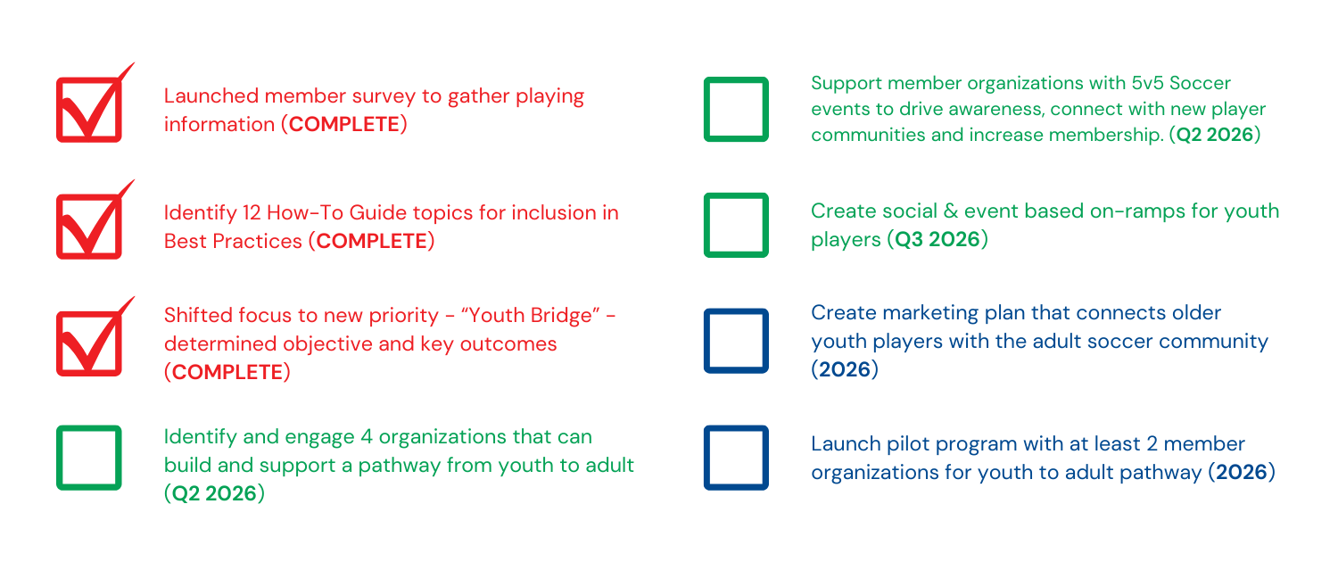 - Create adult player pipelines through collaborative efforts with youth organizations, other athletic associations, and potential partners in the adult athlete sphere of influence